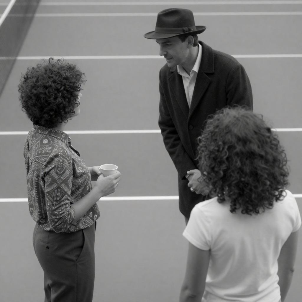 Black-and-white photograph of two scenes: top, a man in a dark coat and hat leans forward, speaking to a woman with curly hair and a patterned blouse, holding a cup; bottom, the man in white stands beside a woman with curly hair, both looking at a tennis court.
