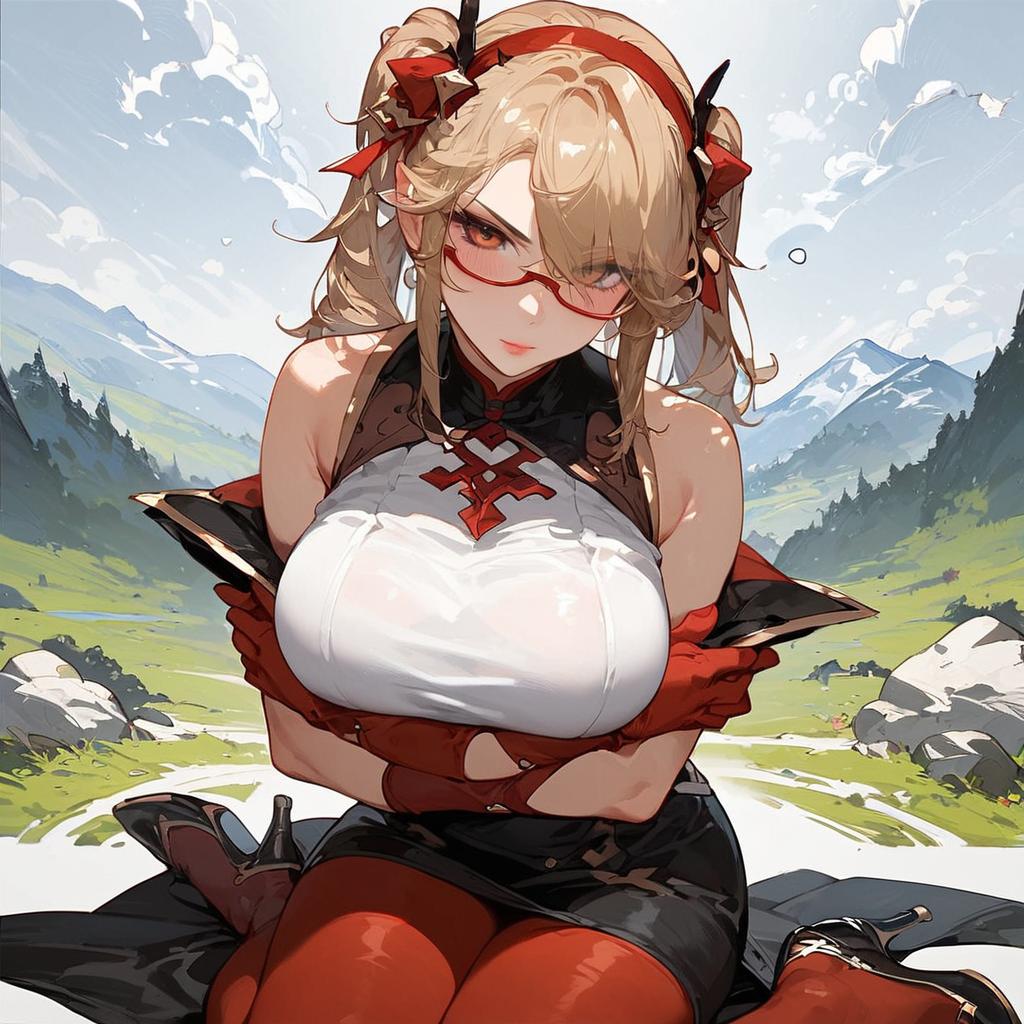 Score_9, score_8_up, source_anime, 1girl, solo, hair ornament, red headband, red glasses, sleeveless shirt, black skirt, red leggings, gloves, high heels, (large breasts:0.8), crossed arms, annoyed, head tilt, looking at viewer, forest, mountains