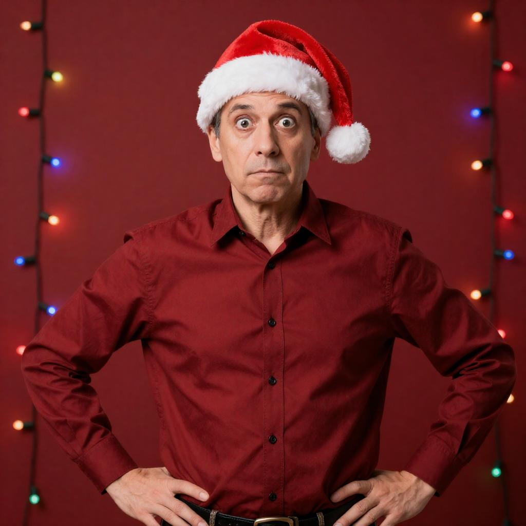 Photograph of a middle-aged man with light skin wearing a red Santa hat and red button-up shirt. He has wide, surprised eyes and a neutral expression. He stands with hands on hips, centered against a red background. Multicolored Christmas lights frame him on both sides.