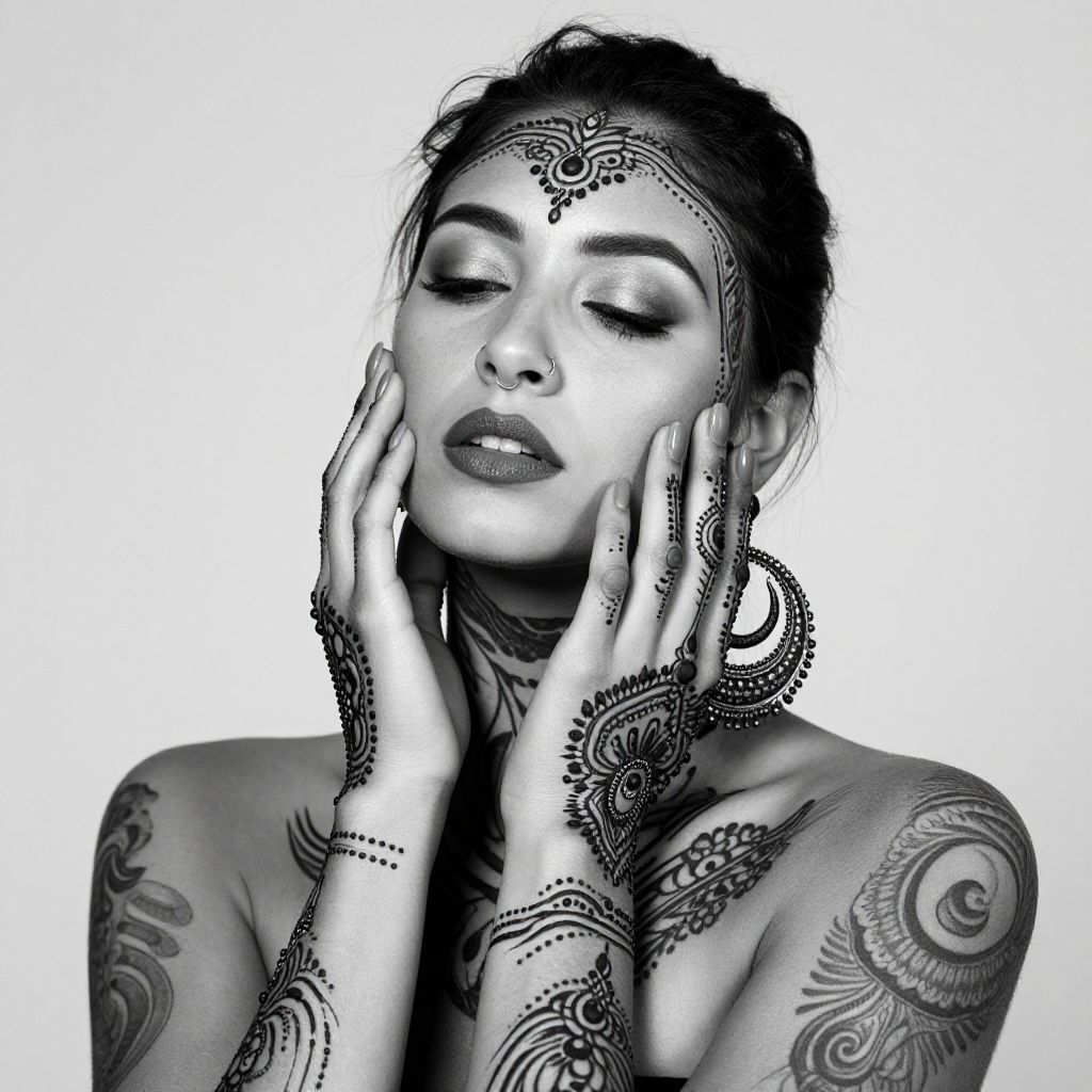 A black-and-white photograph of a tattooed woman with intricate henna patterns covering her face, neck, and hands. She's touching her cheek with her henna-adorned fingers, wearing large, detailed circular earrings. Her eyes are closed, and she has a nose ring. The background is a plain, light gray, highlighting her dark, elaborate tattoos and jewelry. The image has a moody, artistic vibe.