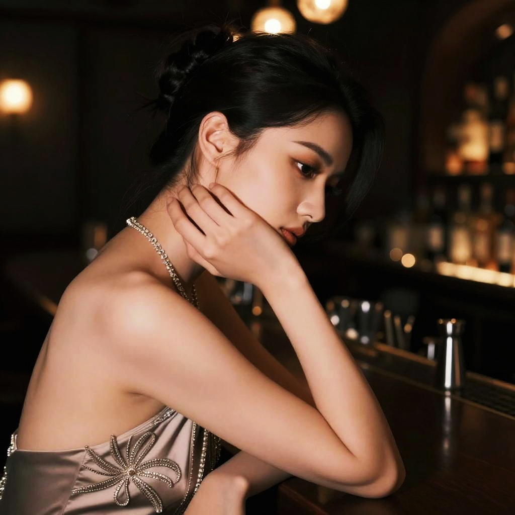 Photograph of a young Asian woman with fair skin and black hair in an elegant updo, sitting in a dimly lit bar. She wears a strapless, beige gown with a floral embellishment and a pearl necklace. Her right hand gently touches her neck, while her gaze is downward and to the right. The background is blurred with warm, glowing lights and dark wooden bar elements. Her makeup is subtle, emphasizing her natural beauty. The mood is intimate and reflective, with soft lighting highlighting her delicate features and graceful pose.