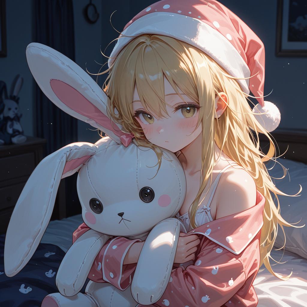 1girl, 18 years old, blonde hair, green eyes, long hair, messy hair, pajamas, nightcap, off shoulder, expressionless, bedroom, stuffed bunny, holding stuffed toy, object hug, masterpiece, best quality