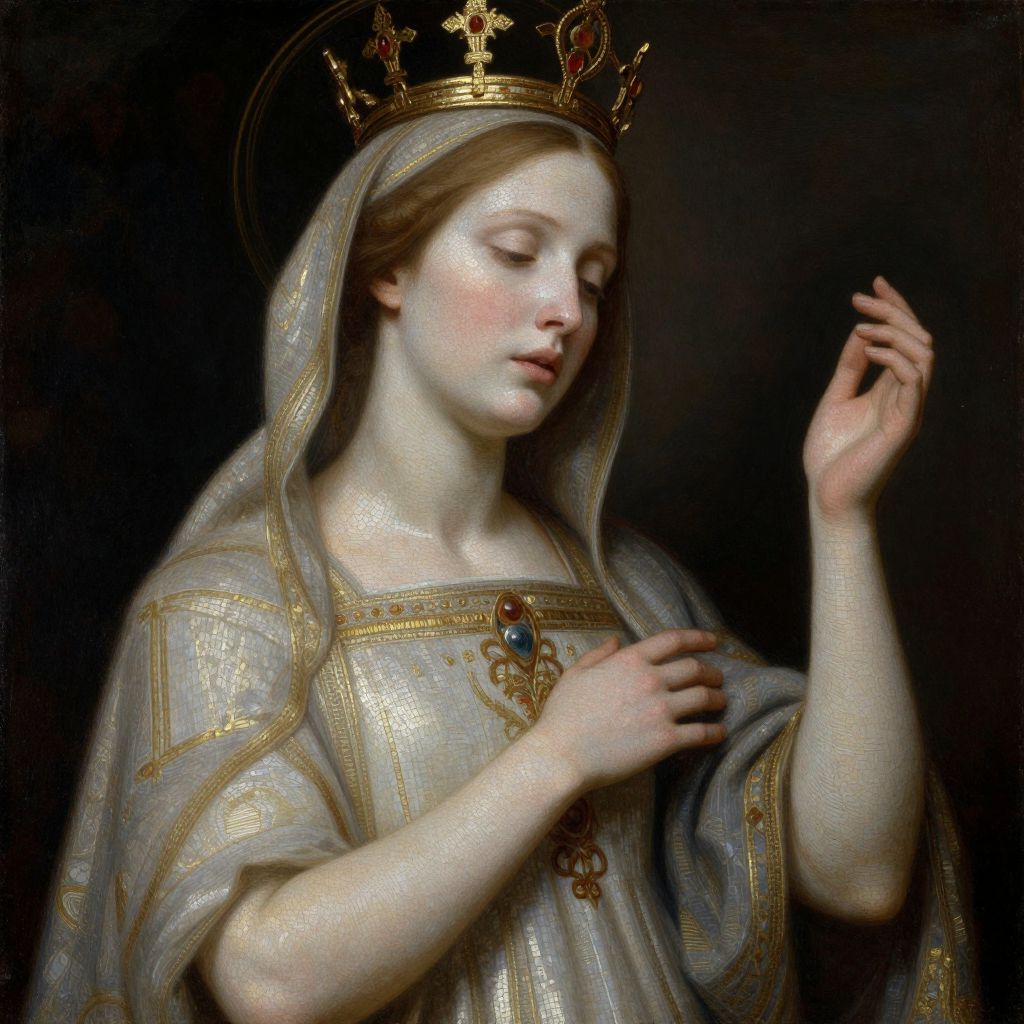 Old-School Our Lady of Fatima with a mushroom cloud in the background, full body portrait, abstract painting brushstrokes by Jeremy Mann,