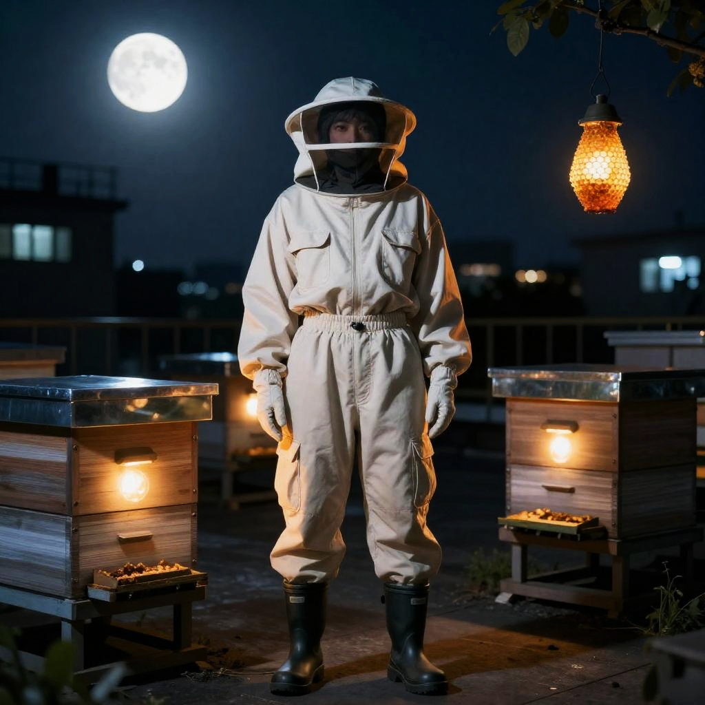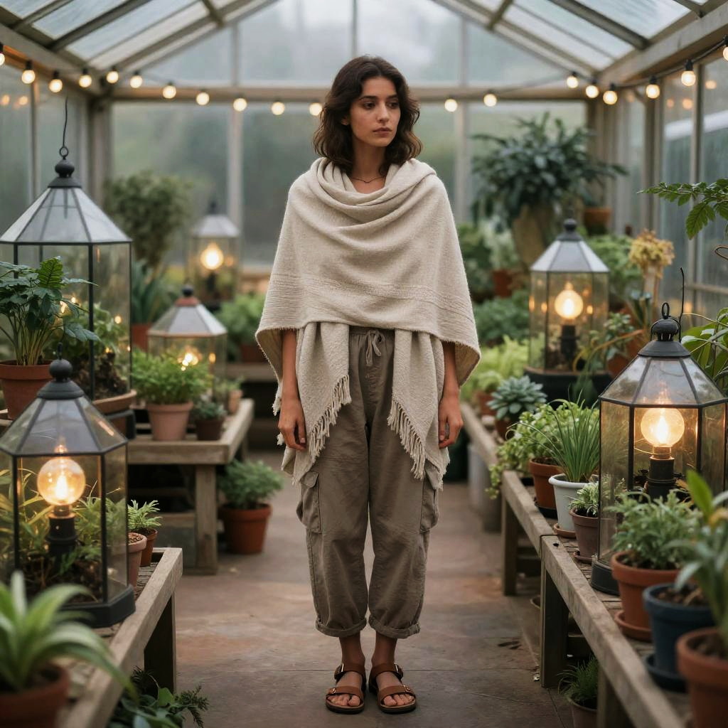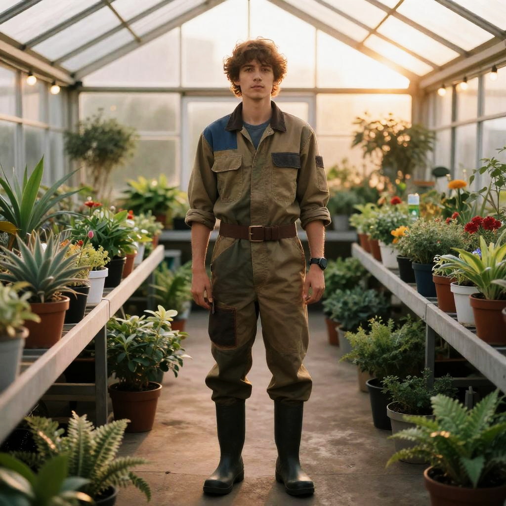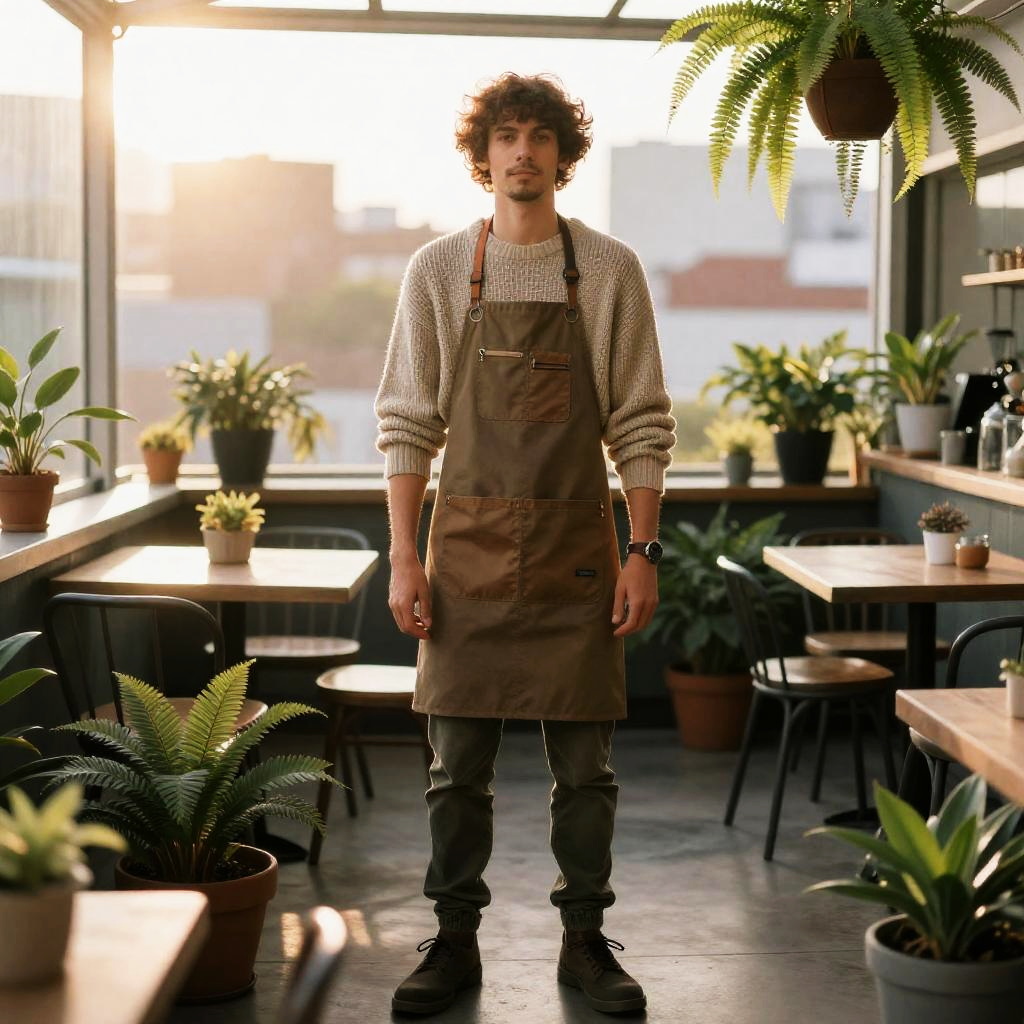 A nomadic barista dressed in utility apron over a layered knit sweater and tapered cargo pants, standing in a rooftop greenhouse café filled with potted coffee plants and hanging ferns overlooking the city, illuminated by soft, warm filtered late-afternoon sun with delicate lens flare.