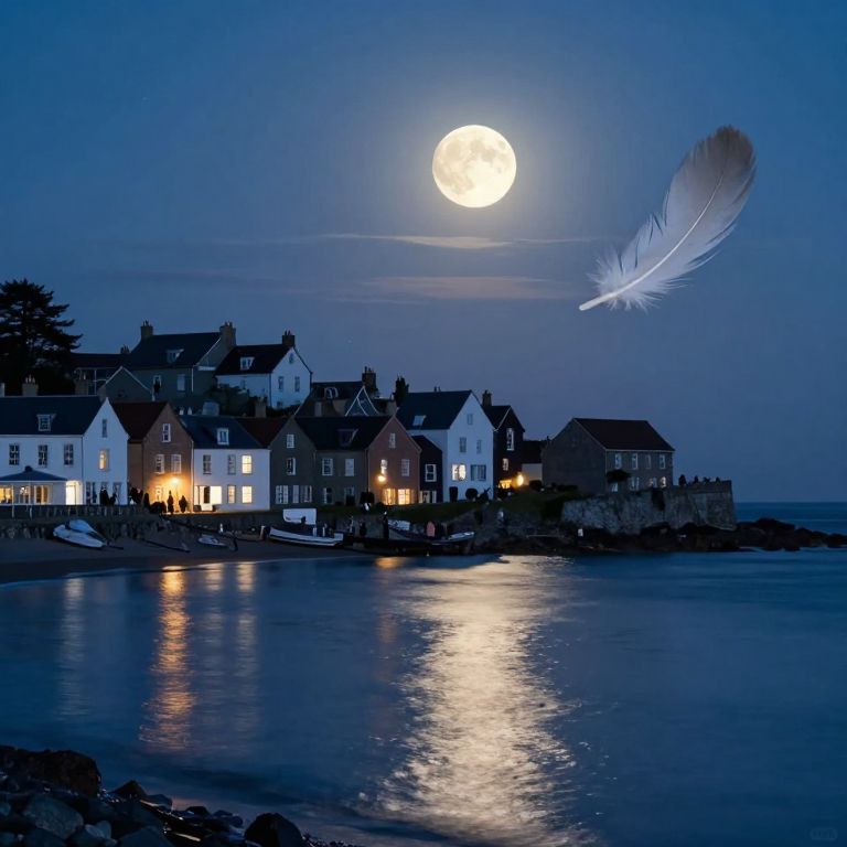 A serene coastal town bathed in the ethereal light of a full moon comes to life from an otherworldly perspective, as if seen through a drifting feather's eyes. This dreamlike fusion captures both intimate details and expansive horizons, with silhouetted figures lingering in dimly lit windows and shimmering reflections dancing on tranquil waters. The image evokes a bittersweet nostalgia, blending the familiarity of everyday life with the whimsical uncertainty of dreams, inviting viewers into a world that feels hauntingly familiar yet utterly fantastical.