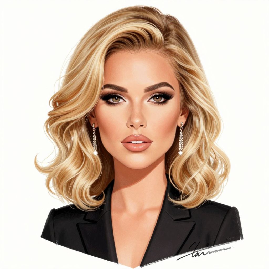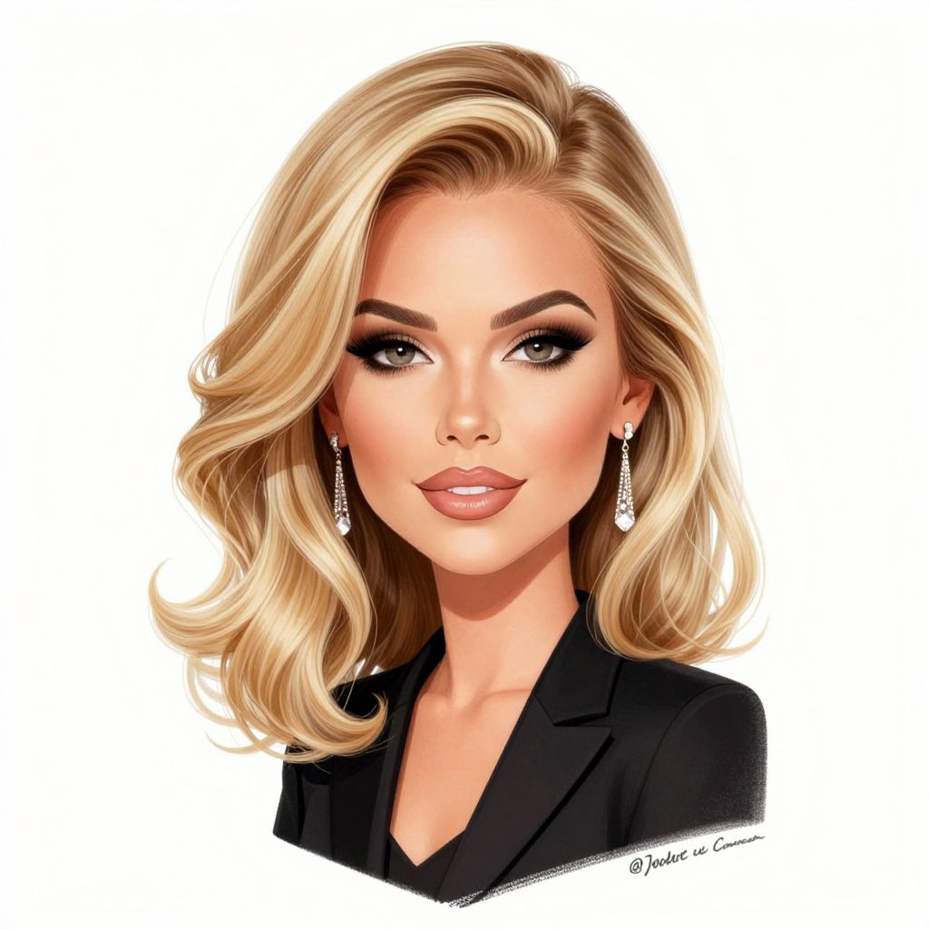 The image depicts a highly stylized caricature of a woman with shoulder-length, wavy blonde hair. Her hair is voluminous and appears to be styled with a touch of elegance. She is wearing a black blazer, which adds a formal touch to her appearance. The woman has a pair of dangling earrings that catch the light, adding a subtle sparkle to her look. Her makeup is meticulously applied, with defined eyebrows, smoky eye makeup, and a soft pink lip color. The overall composition is balanced, with the woman's face centered and her hair framing it beautifully. The background is plain white, which helps to highlight the subject without any distractions. The caricature is signed by the artist, indicating a personal touch and adding a sense of authenticity to the artwork.