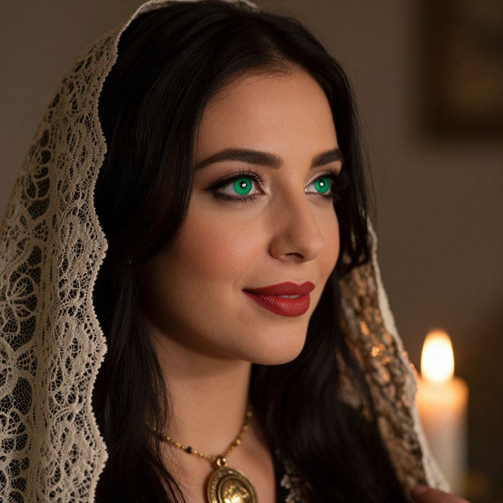 Photograph of a woman with striking green eyes, dark hair, and red lipstick, wearing a lace veil and gold necklace, lit by soft candlelight