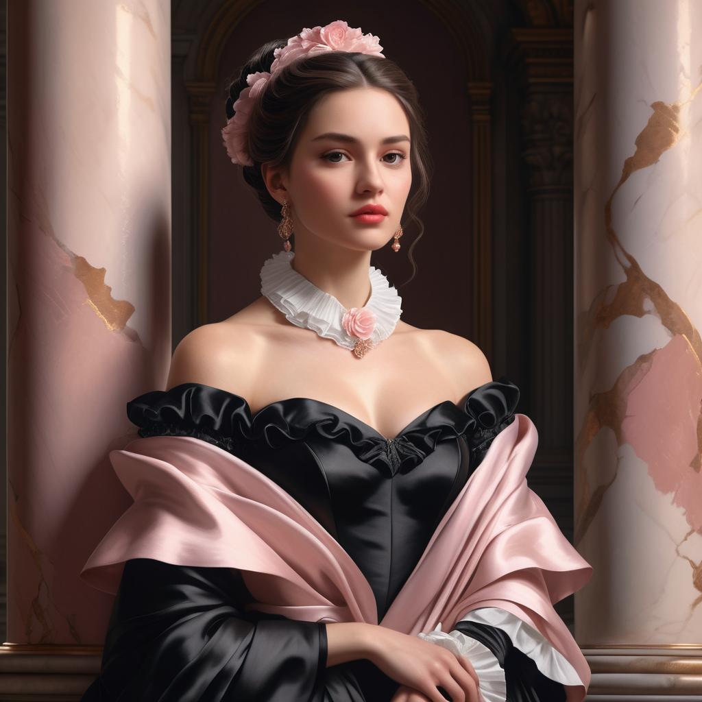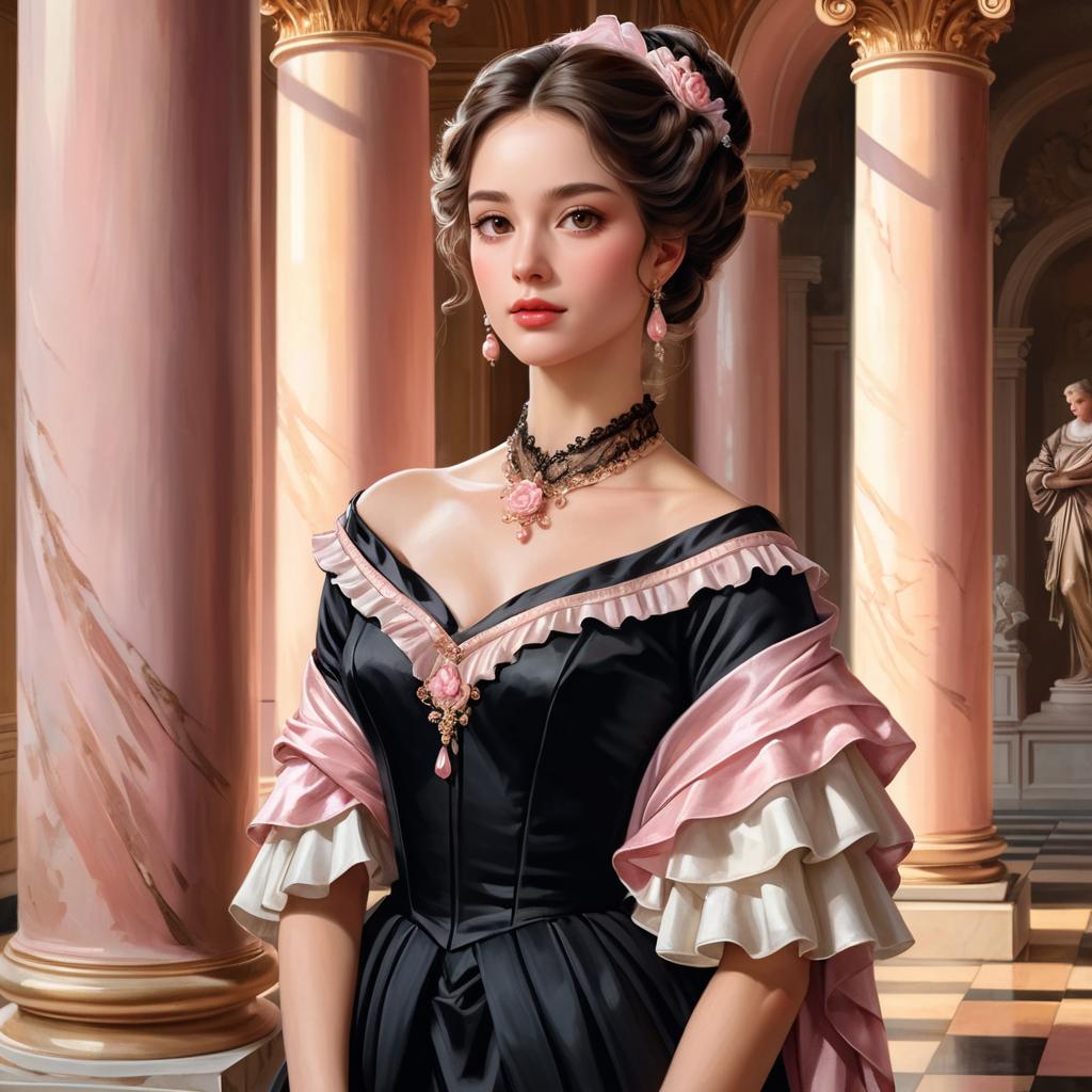 Portrait of a young woman wearing an elegant Victorian-style black dress with white ruffled collar and a pale pink satin shawl. She stands gracefully in a historical building adorned with pink marble columns and a checkered marble floor.