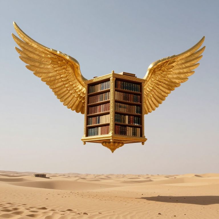 Photograph of a golden-winged, multi-story bookshelf floating in a clear, blue sky above a vast, sandy desert. The bookshelf, adorned with large, detailed golden wings, is centered in the image and features multiple shelves filled with various books. The desert below has gentle dunes, and a small, distant structure is visible on the left. The overall composition combines fantasy elements with a realistic desert landscape, creating a surreal, otherworldly scene. The golden hues of the bookshelf and wings contrast with the warm, beige tones of the sand.
