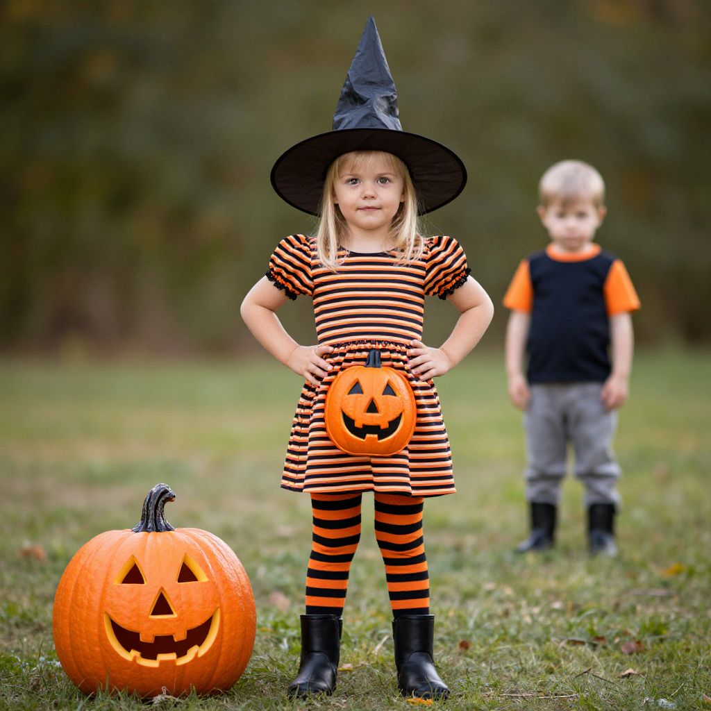 Crafty little witch toddler, hat, solo, witch hat, blonde hair, halloween, striped clothes, jack-o'-lantern, pantyhose, dress, striped pantyhose, hand on own hip, puffy sleeves, pumpkin, 1boy, full body, standing, short sleeves, boots, puffy short sleeves, male focus, black footwear