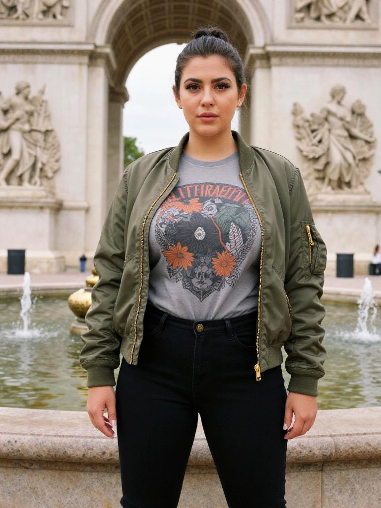 Photograph of a curvy woman with dark hair, wearing a brown hat, white "Henderson Requierpot" t-shirt, and blue