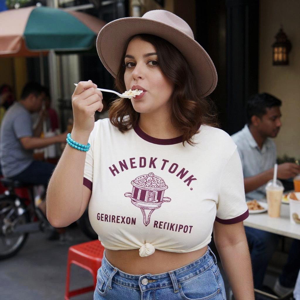 A lanky woman in a casual cropped off-white graphic t-shirt with maroon trim and fitted denim jeans, accessorized with turquoise beaded bracelets and a light brown wide-brimmed felt hat, enjoying a street food experience in Hanoi Old Quarter, captured in an instant film style. Sexy. Pretty face and beаutiful eyes. Big breasts