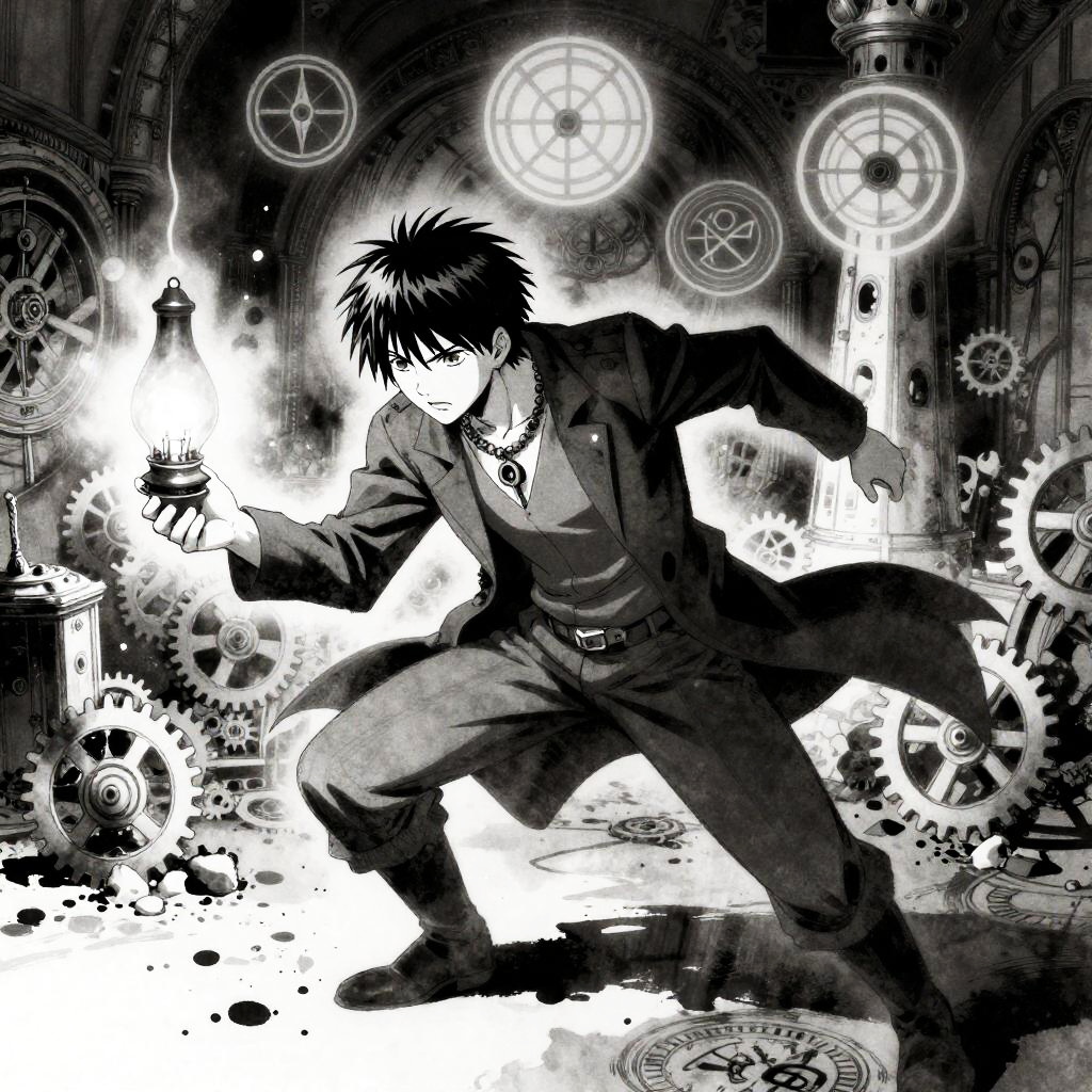 Dynamic illustration of an enigmatic clockwork alchemist in the signature style of Tatsuki Fujimoto, featuring sputtering gaslight with jagged ink-shadow contrasts and a background filled with abandoned clocktower interior filled with floating alchemical sigils and shattered gears