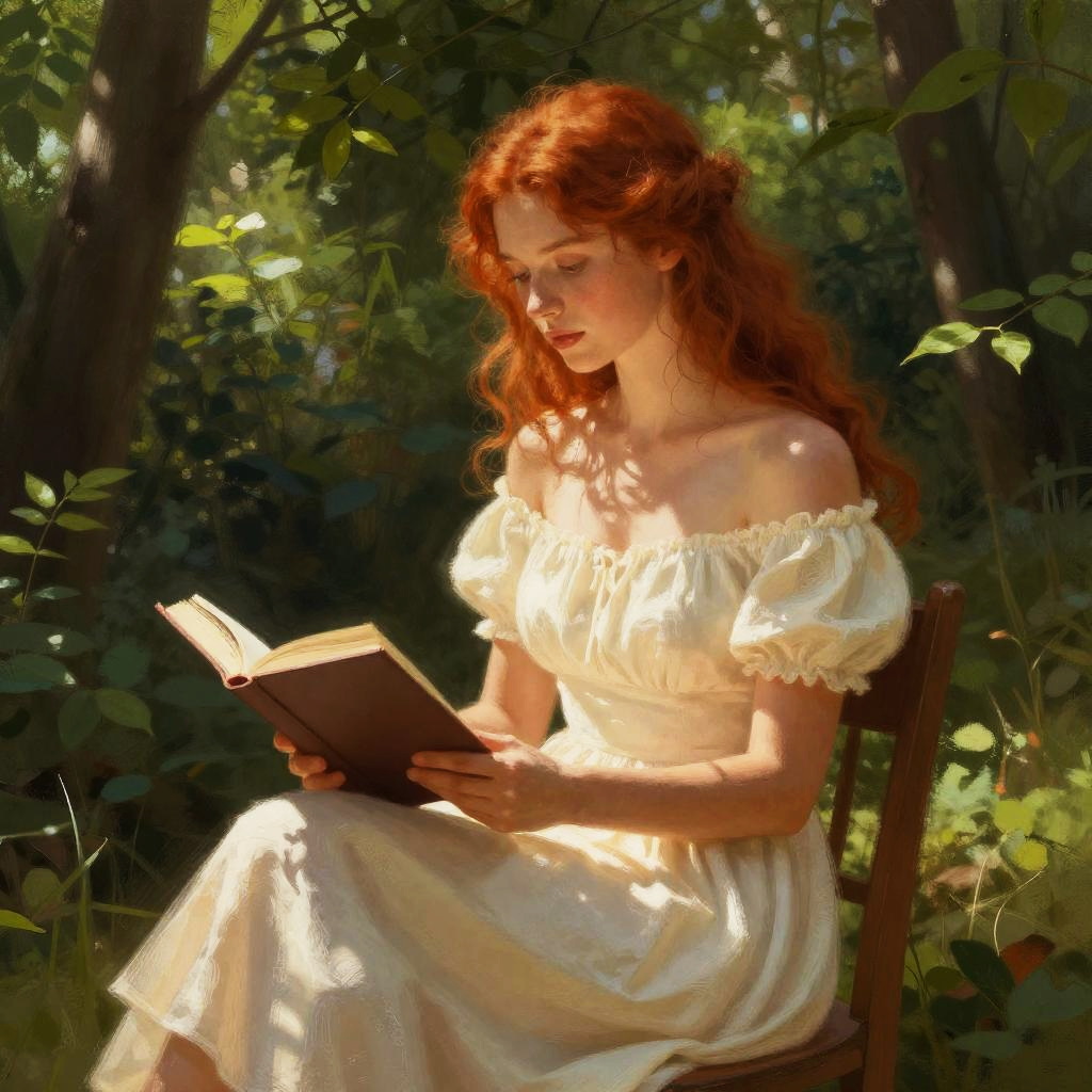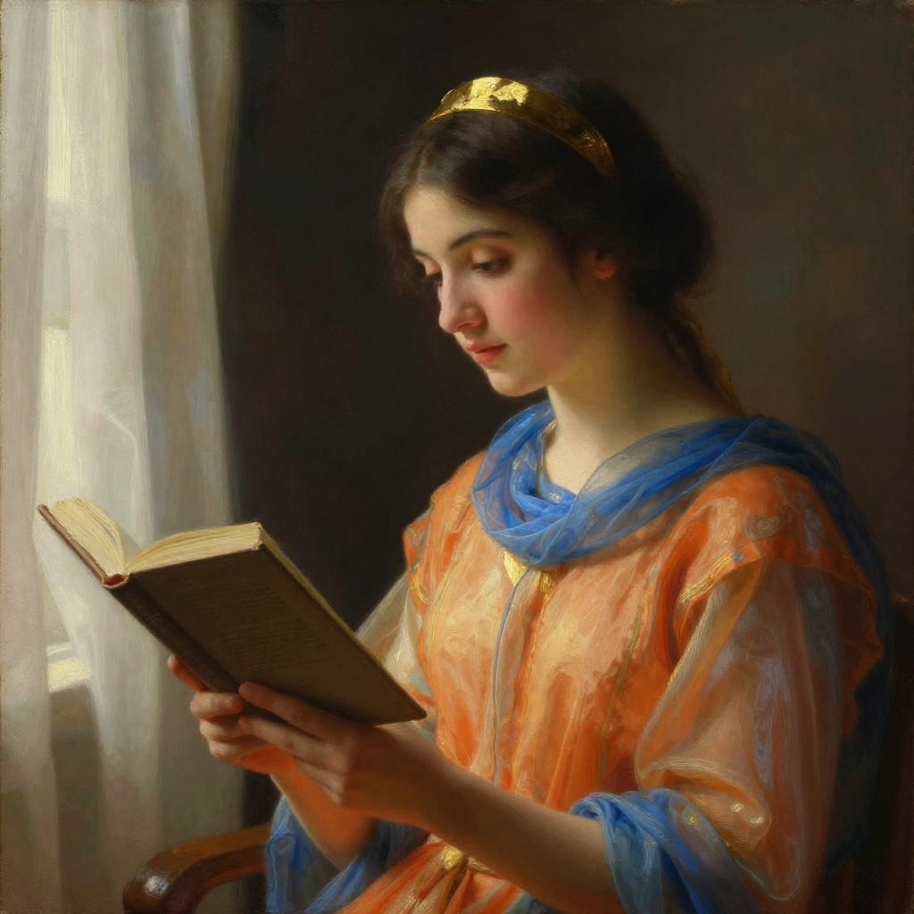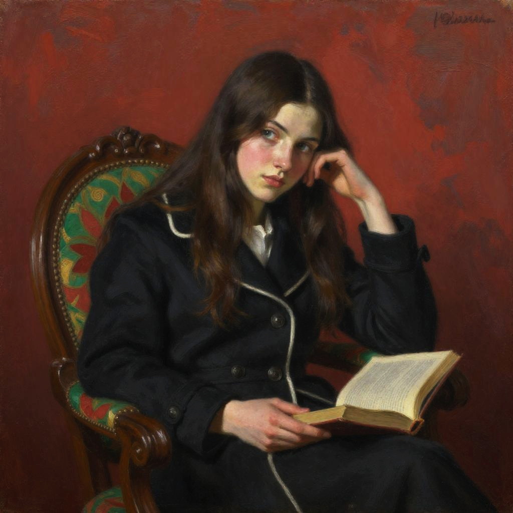 This is a digital painting of a young woman with pale skin and dark curly hair, sitting against a dark brown background. She's wearing a long, white, lace-trimmed blouse and is holding a red book open in her right hand, looking at it with a slight smile. The painting has a textured, impressionistic style with bold brushstrokes and warm, muted colors.