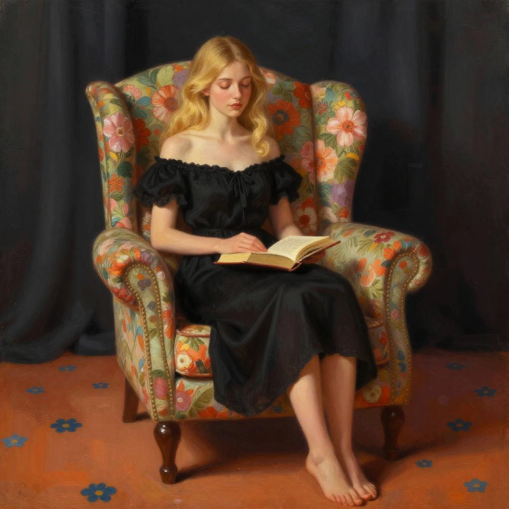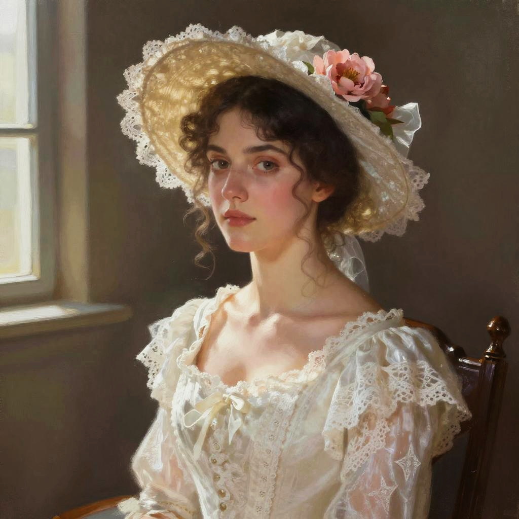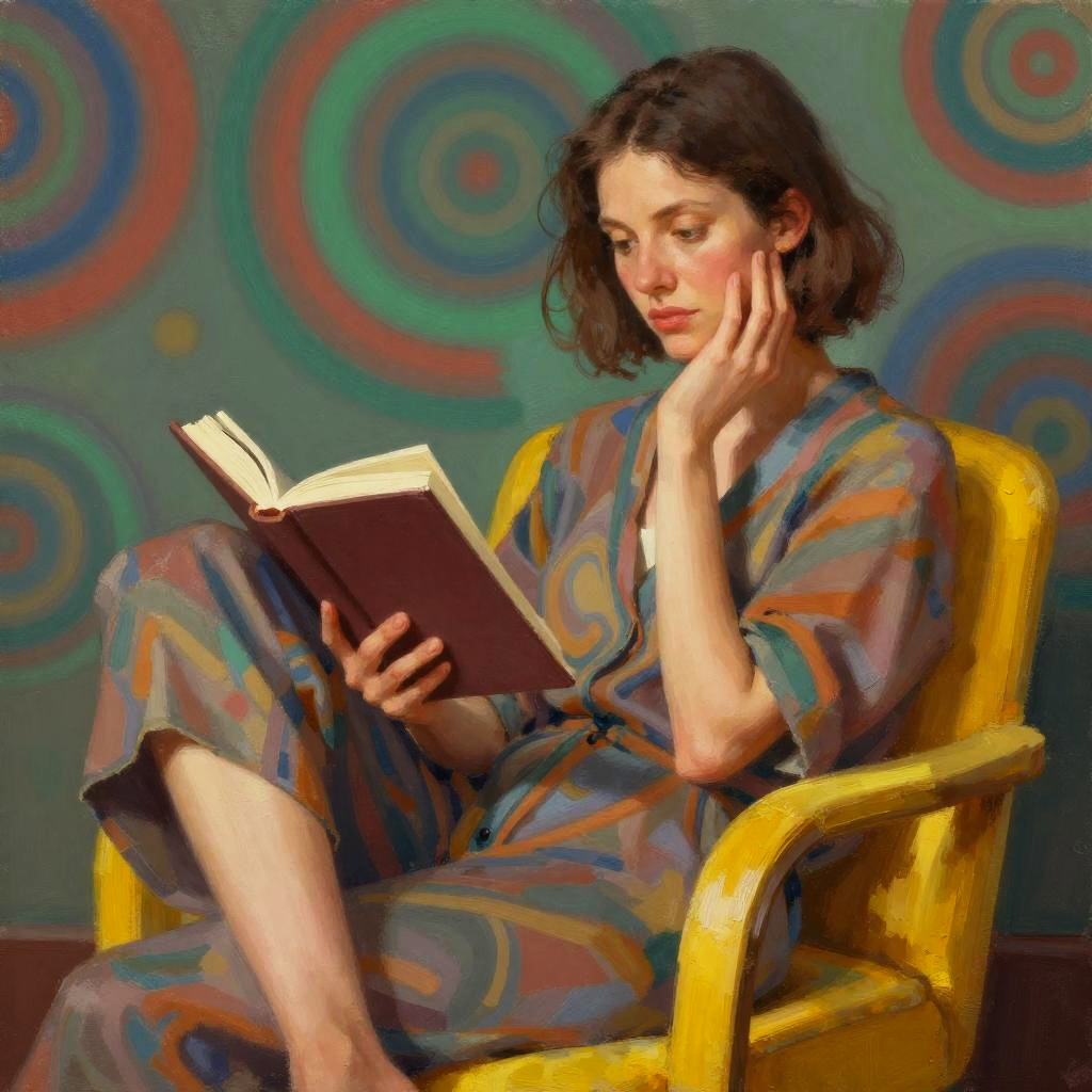 This is a digital painting of a young woman with pale skin and dark curly hair, sitting against a dark brown background. She's wearing a long, white, lace-trimmed blouse and is holding a red book open in her right hand, looking at it with a slight smile. The painting has a textured, impressionistic style with bold brushstrokes and warm, muted colors.