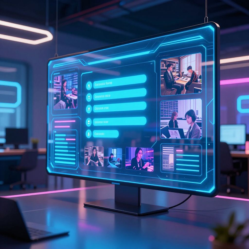 Photograph of a futuristic, illuminated digital display in a modern office setting. The screen, glowing with vibrant blue neon lights, shows multiple video chat windows of business professionals in suits, working on laptops. The screen includes menu options with glowing blue icons and text. The background features dimly lit, sleek office furniture with neon blue and pink strip lighting. The image has a high-tech, cyberpunk aesthetic with sharp contrasts and vivid colors. The display is mounted on a black stand and set against a blurred office environment.