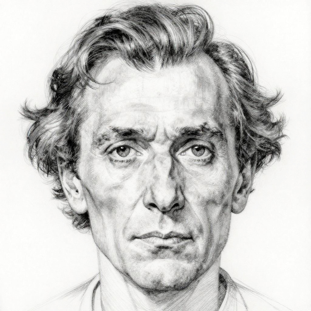 A sketch pencil drawing in black and white of a older man's face with a comb over in his auburn hair. Inspired by Gustav Klimt, figurative art, front view. Detailed pencil sketch capturing delicate features and subtle expressions.
