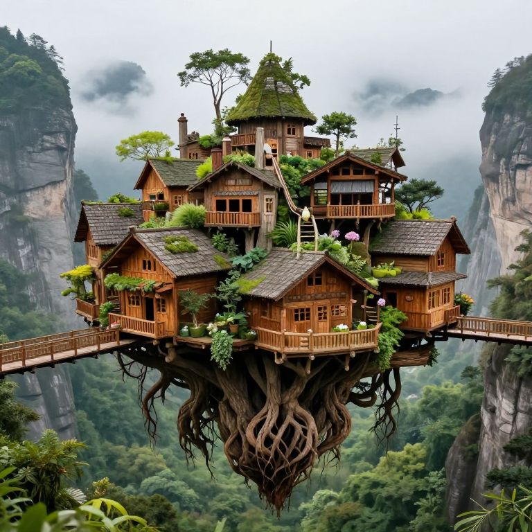 A whimsical wooden village perches improbably atop a colossal, root-like structure that defies gravity, its rooftops adorned with lush gardens and connected by cascading walkways, all suspended dramatically against a backdrop of misty mountains and verdant cliffs.