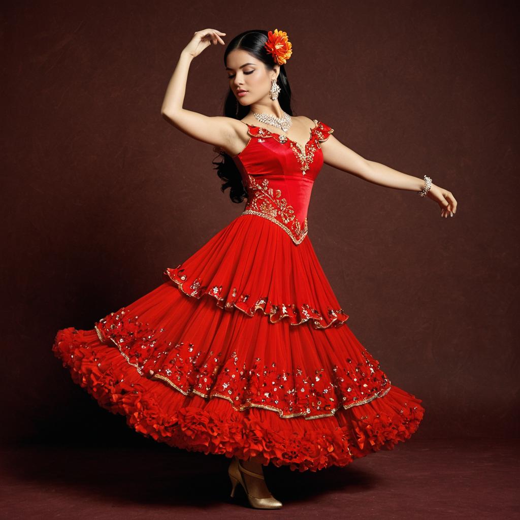 Spanish dancer costume,1girl, dancing, solo, dress, flower, black hair, red dress, hair ornament, hair flower, brown background, standing, jewelry