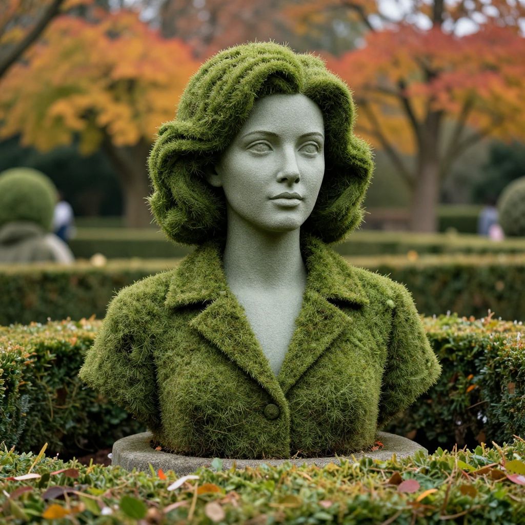 Gardeners meticulously craft a lifelike topiary bust of a woman with voluminous green hair and a collared jacket, set against a backdrop of manicured hedges and vibrant autumn foliage.