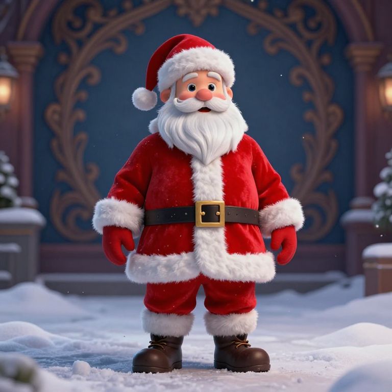 A 3D-rendered Santa Claus stands confidently in the center of a snowy, dimly-lit room with an ornate, dark blue and brown mural in the background. He's wearing a classic red velvet coat with white fur trim, a matching hat, and brown boots. His long white beard and mustache are detailed and fluffy. The snow-covered floor adds a festive touch to the scene.