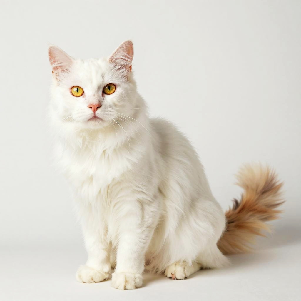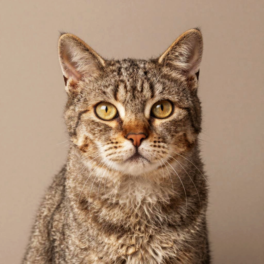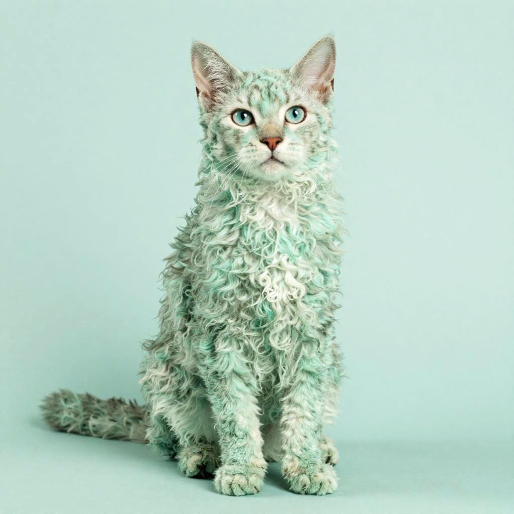 Photorealistic portrait of a LaPerm over a solid mint green. The image showcases the curly medium coat, expressive eyes, slender frame of the cat in high resolution, set against a clean, minimalistic background that emphasizes the cat's features. Styled with sharp detail and natural lighting, creating a professional and lifelike depiction of the cat.