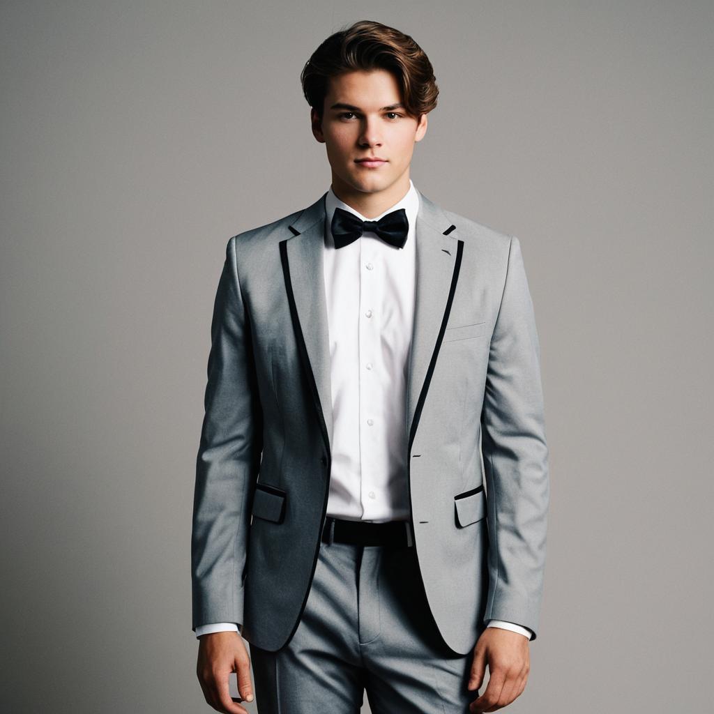 Theme costume man,1boy, male focus, solo, bow, pants, jacket, bowtie, vest, black bow, shirt, green vest, white shirt, grey background, brown pants, looking at viewer, standing, brown jacket, closed mouth, black bowtie, rose, realistic, long sleeves, brown hair, open jacket, open clothes, simple background, flower, arms at sides, collared shirt