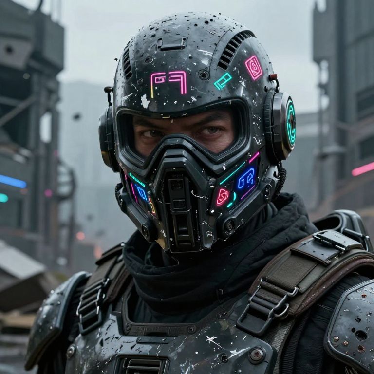 A half - masked rugged laboratory engineer man with cybernetic enhancements as seen from a distance, scifi character portrait by greg rutkowski, craig mullins, 1 / 4 headshot, cinematic lighting, dystopian scifi outfit, profile picture, mechanical, cyborg, implants, dieselpunk