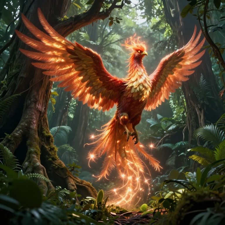 A digital masterpiece showcasing a powerful phoenix emerging from its rejuvenation in a peaceful, idyllic setting bathed in the enchanting golden hour light. The phoenix's radiant plumage, transitioning between opulent gem-like hues and gleaming metallic sheens, symbolizes the triumphant cycle of life reborn. As it unfurls its wings, an atmosphere of reverence and amazement envelops the scene, with the surrounding flora and fauna seeming to come alive in harmony with nature's transformative energy. This elevated perspective allows for a comprehensive appreciation of the phoenix's majestic beauty as it soars towards the golden skies.