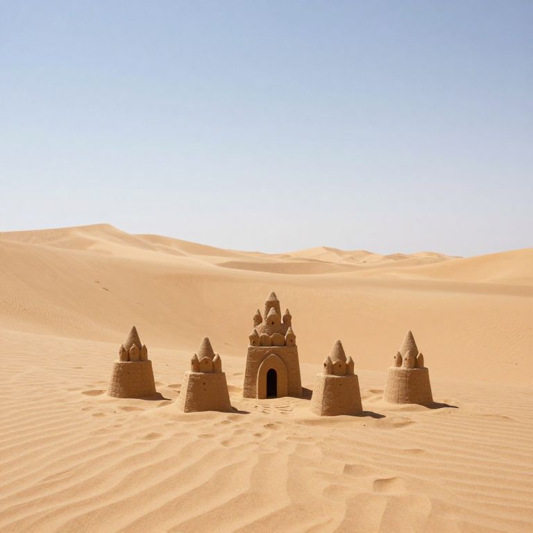 Photograph of five sandcastle towers in a vast, sunlit desert with rippled sand and clear blue sky. Central tower has an arched entrance