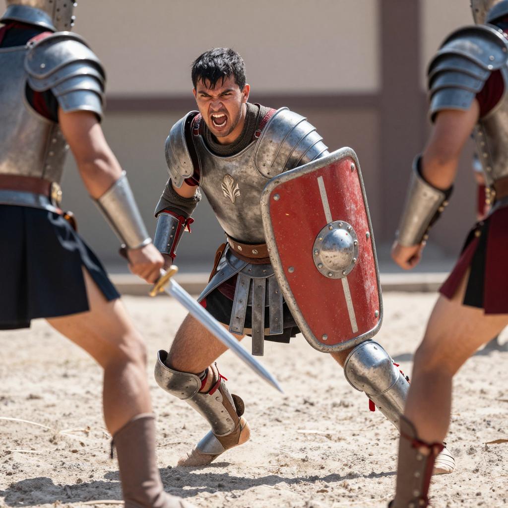 Action photograph of a gladiator battle. Male gladiator with short black hair, wearing gray armor, shield, and sword, crouches and screams, holding shield in front. Opponent's armored leg and sword arm in foreground. Bright sunlight, shadowed background. Gladiators in dynamic combat stance. Two people. Intense facial expression on male gladiator. Shield has worn ure, sword in right hand.