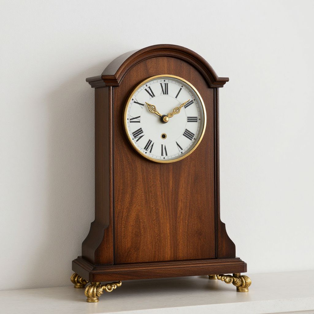 Elegant wooden mantel clock featuring Roman numerals, gold accents, and ornate brass feet, showcasing timeless craftsmanship against a minimalist backdrop.