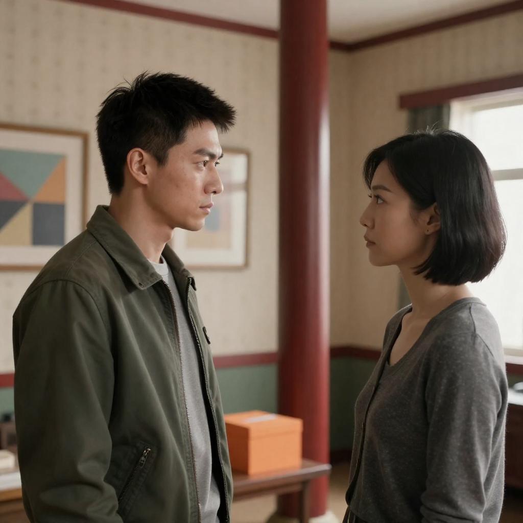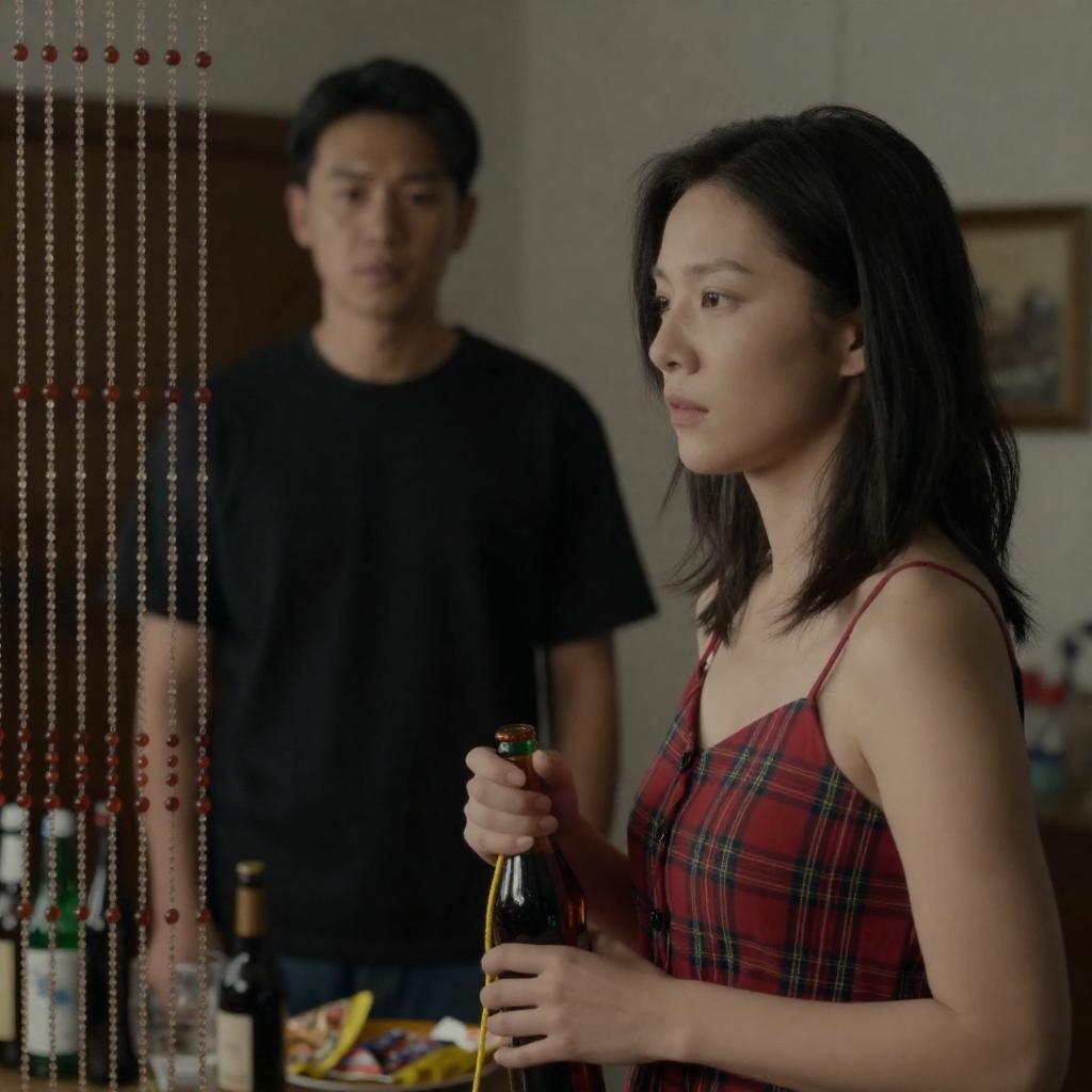 Photograph of two people in a room with floral-patterned wallpaper. Woman in red robe stands in doorway, serious expression. Man in light blue shirt sits on bed, looking to the side. Floor lamp with two bulbs on bedside table.