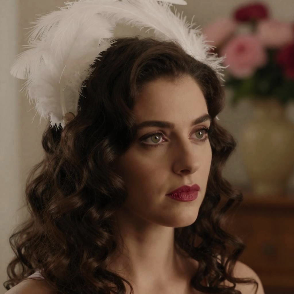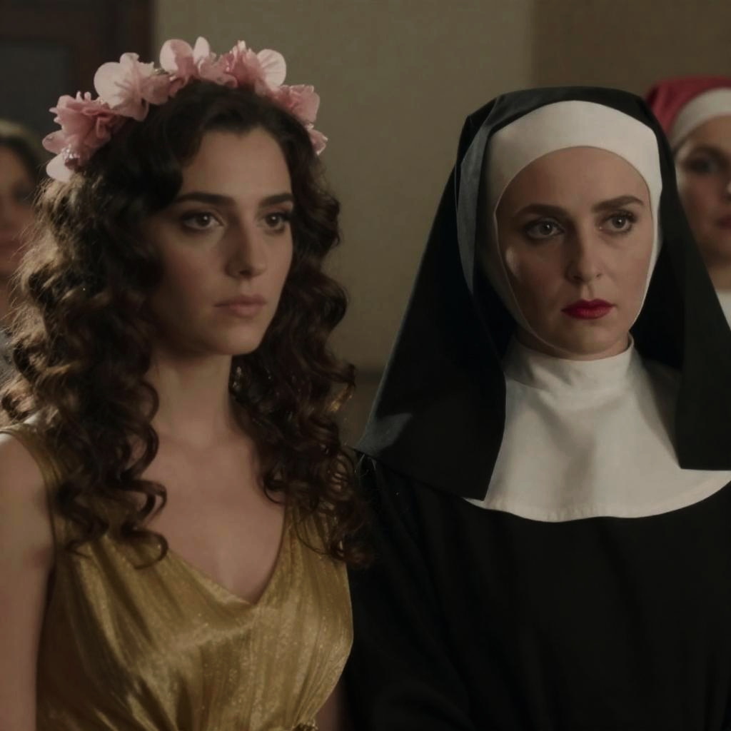 Photograph of two women. Woman on left with curly brown hair, pink headpiece, golden dress, neutral expression. Woman on right in black nun's habit, white face, red lipstick, intense gaze. Partially visible third person in red headgear. Dimly lit indoor background.