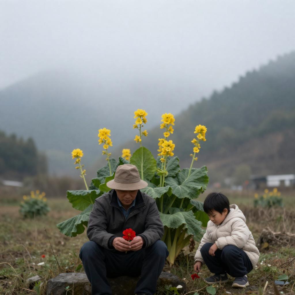 Farmers in a Misty Meadow Landscape
