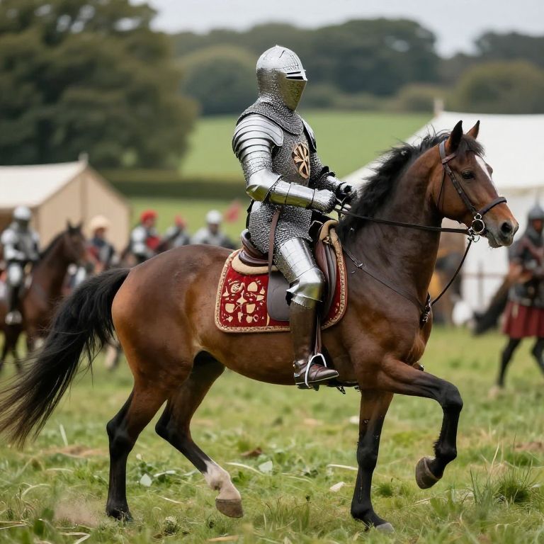 Irish medieval armor featuring chainmail and embossed symbols, worn by a knight on horseback in a lush medieval battlefield, dynamic pose, vibrant colors, highly detailed realism