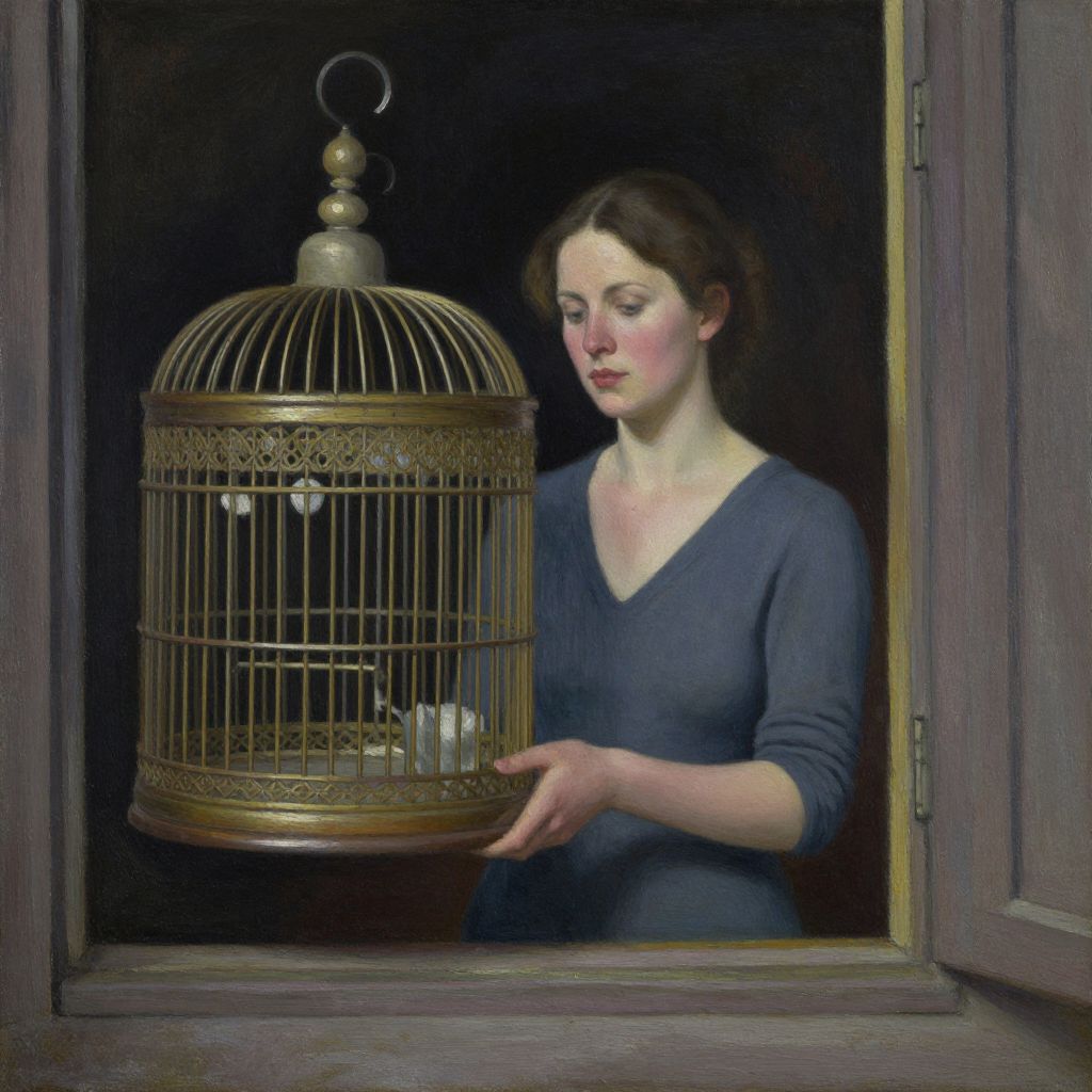 This is a realistic oil painting depicting a young woman with fair skin and brown hair, wearing a dark blue V-neck dress, gently holding an ornate, gold-colored birdcage with her right hand. She stands in a dimly lit window frame, which is wooden and painted in a muted purple hue. The birdcage is large, with intricate patterns on the base and top, and contains a small white object, possibly a bird. Her expression is calm and contemplative, with a slight blush on her cheeks. The background is dark, highlighting her and the birdcage as the focal points. The texture of the painting is smooth with detailed brushwork.