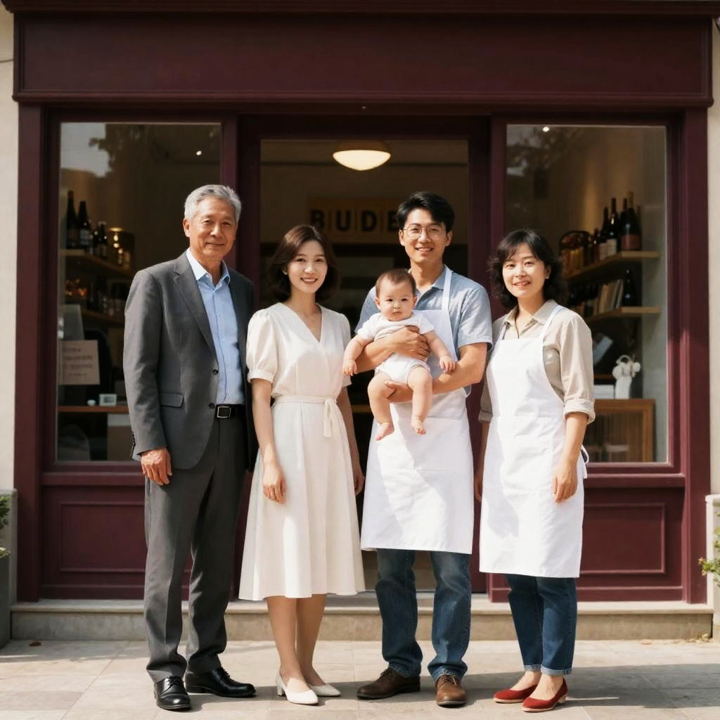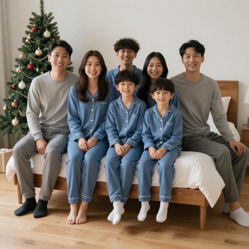 Family photograph, seven people in a cozy living room. People in blue pajamas, one in gray shirt. Parents and children, mixed ages, sitting on a bed with wooden headboard. Christmas tree and decorations in background. Smiling faces, casual poses. Light wood floor, soft lighting. Family gathering, close-knit.