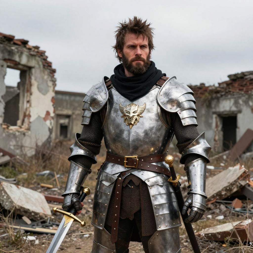 A rugged, bearded man with spiky brown hair stands confidently in the foreground, wearing shiny, silver medieval armor with a black scarf and brown belt. He holds a sword in his right hand, while debris and ruins of a dilapidated building are in the background. The sky is overcast, and the overall scene has a gritty, post-apocalyptic vibe. The photograph has a realistic, dramatic style.