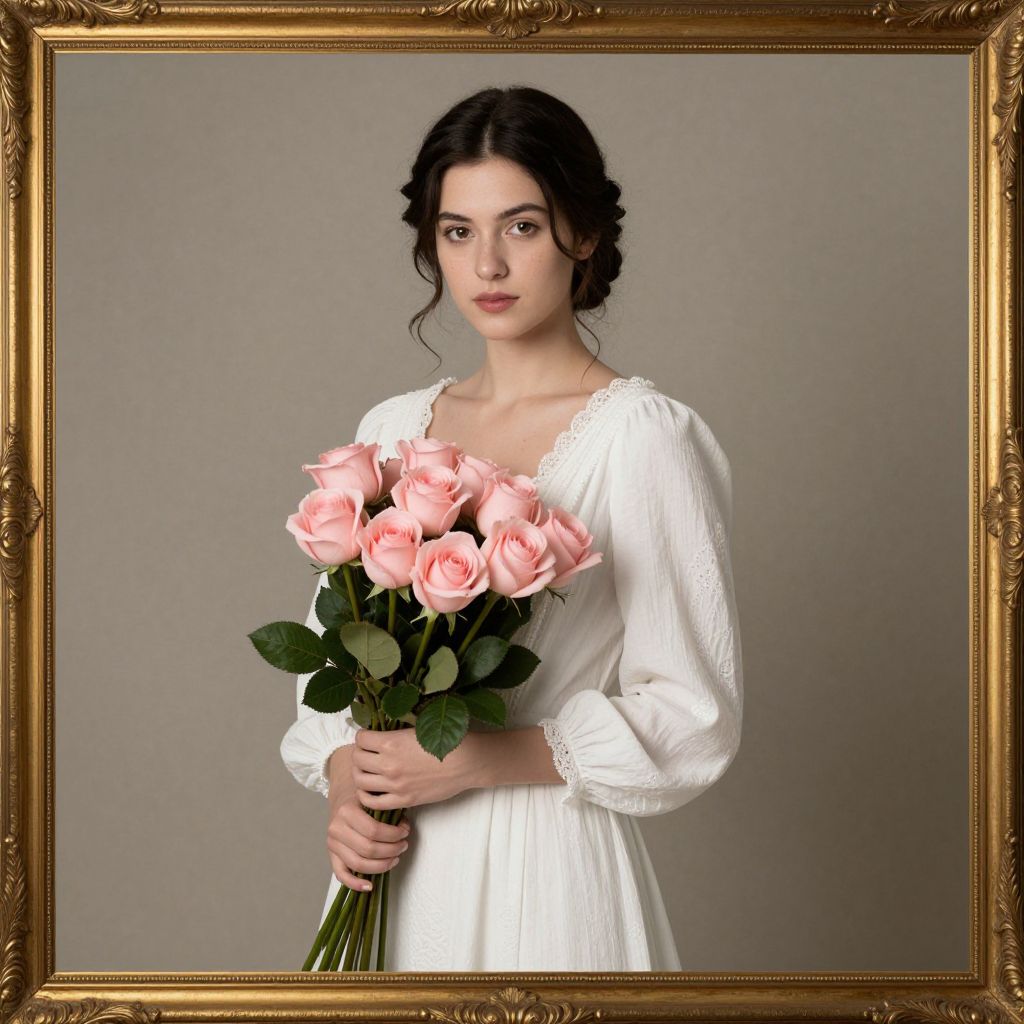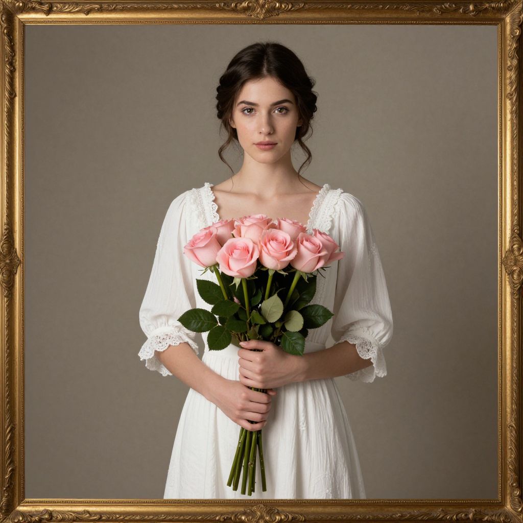 Young woman in a vintage white dress stands gracefully against a neutral backdrop, her dark hair elegantly styled, as she holds a bouquet of six delicate pink roses with lush green foliage, framed by an ornate golden border.