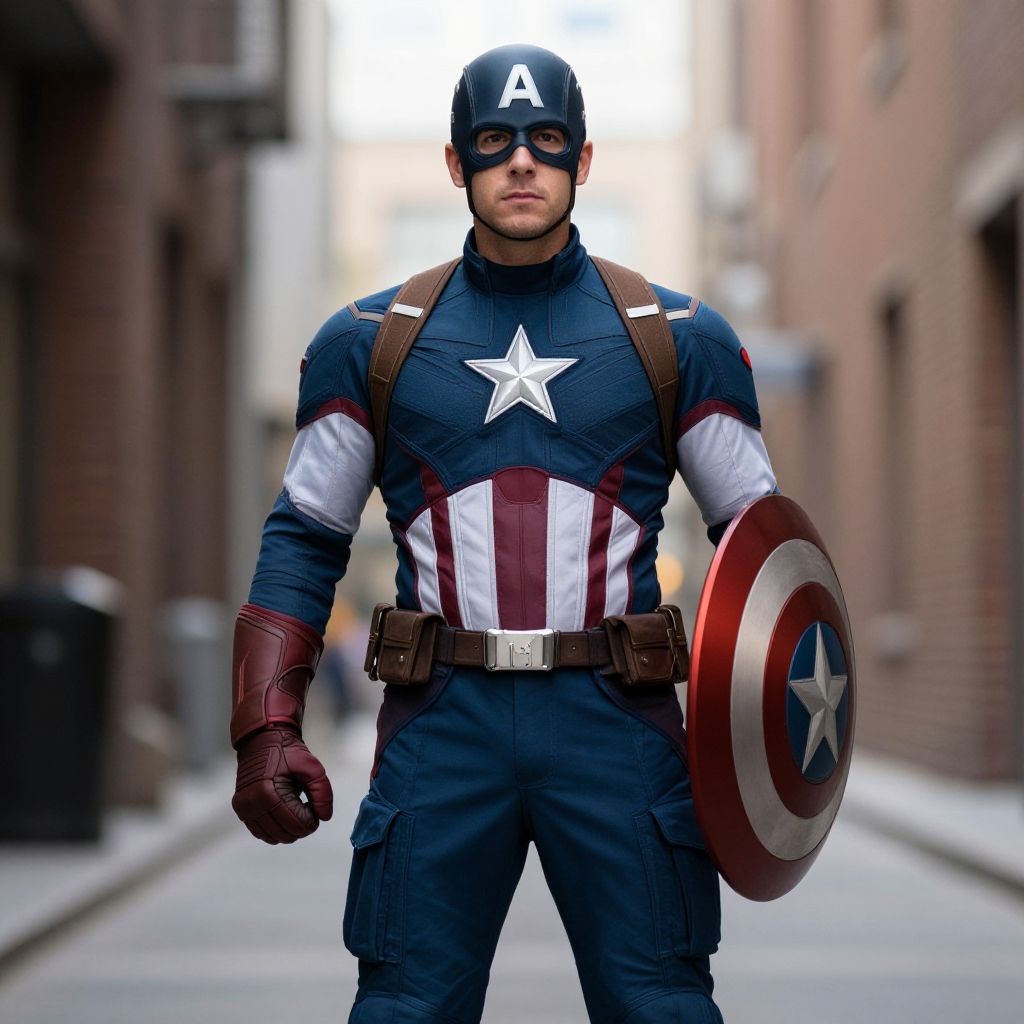 A person in a full Captain America costume stands heroically in an urban alley, invoking the iconic Marvel superhero's look from the MCU movies.