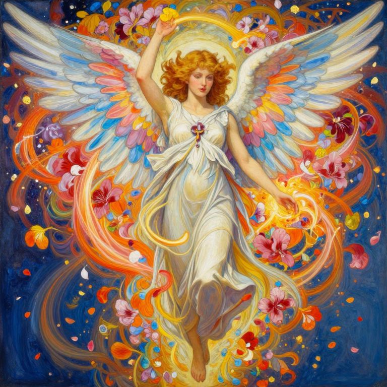 Digital painting of a radiant, winged, red-haired angel with flowing white dress, surrounded by vibrant flowers and swirling colors against a dark blue background.