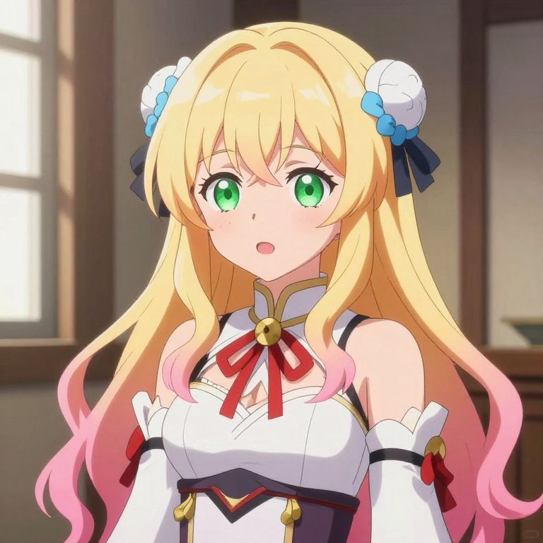 This digital anime-style drawing features a blonde girl with long, ombre hair that fades from yellow to pink at the ends. She has large, vibrant green eyes and wears a white, sleeveless dress with a red ribbon tied at the collar and black trim. Her hair is styled in two white, round hairpieces adorned with blue beads. She also wears white, detached sleeves with red accents. The background shows a blurred interior with wooden frames and a window letting in light. The girl's expression is slightly surprised or curious. The overall style is bright and colorful, typical of modern anime artwork.