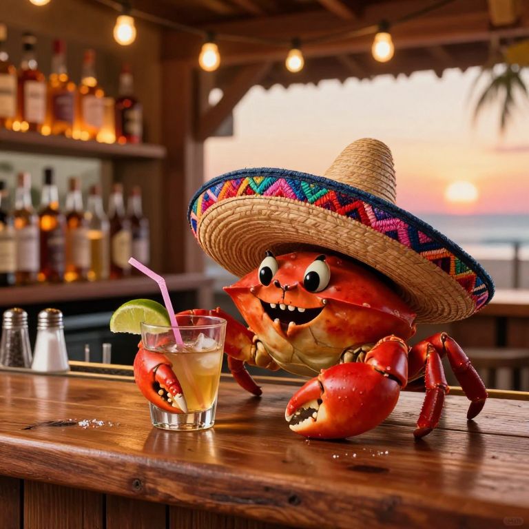 Prompt: A whimsical and lively scene of a bright red crab perched confidently on a wooden bar counter, its claws resting casually near a glass of tequila with a tiny lime wedge on the rim, The crab wears a slightly oversized sombrero, its colorful embroidery and woven details standing out against its shiny shell, One claw holds a tiny straw, playfully dipping into the tequila glass, adding a humorous touch, The bar has a warm, rustic vibe, with aged wood planks, scattered salt shakers, and a faint glow from string lights hanging overhead, Behind the crab, shelves are lined with rows of tequila bottles, glowing amber in the soft, golden light, A faint hint of a beachfront can be seen through a window in the background, with a setting sun casting warm orange and pink hues across the scene, The crab’s expression is full of character, with raised eyestalks that seem to suggest it’s enjoying the moment, The overall atmosphere is playful and relaxed, blending the quirky humor of the crab's unlikely setting with the festive spirit of a Mexican cantina