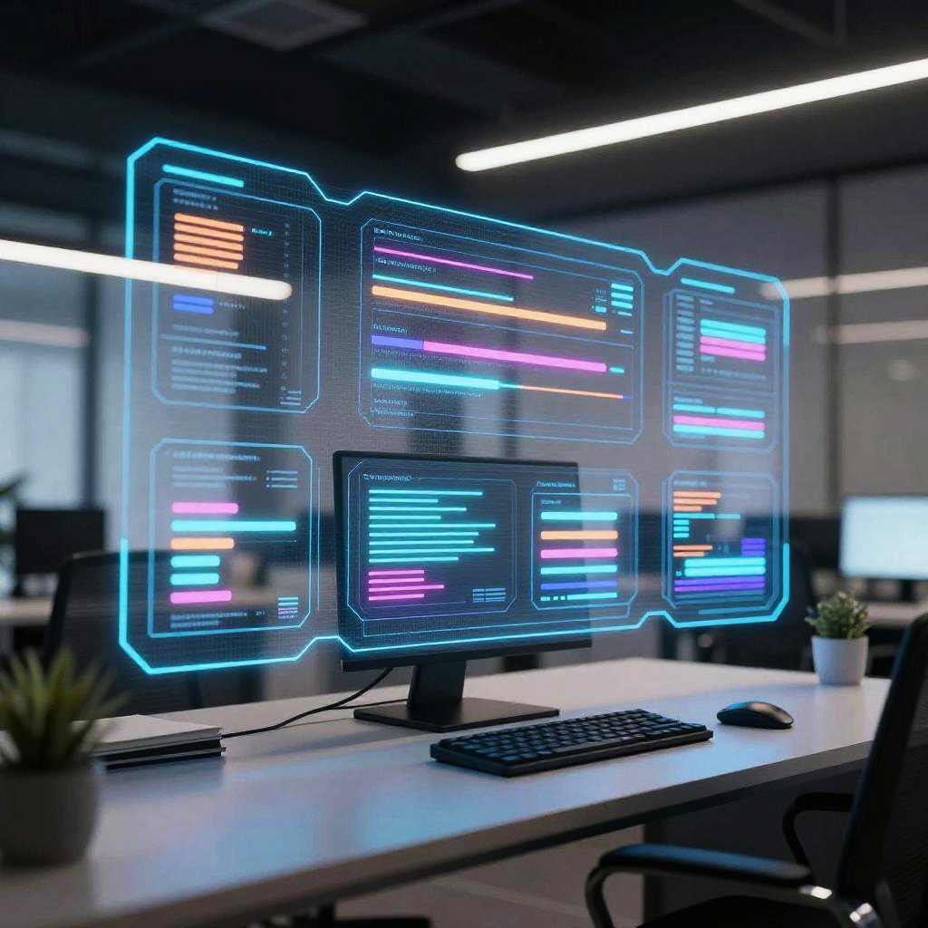Edit anything digital workspace, futuristic holographic interface, seamless multitasking screens, vibrant neon colors, high-tech modern office environment, cinematic lighting