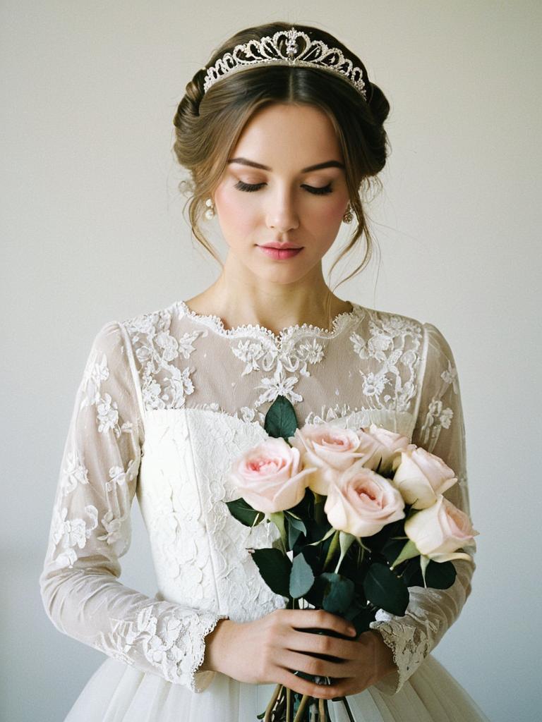 A young woman in an elegant white lace wedding dress sitting near a large window with soft natural light, bright airy interior with pastel tones and delicate floral details on the dress, calm and romantic atmosphere, soft focus on the textures of fabric and lace, white and cream color scheme