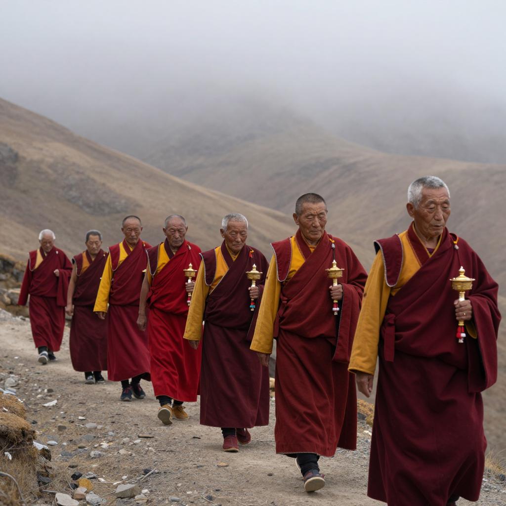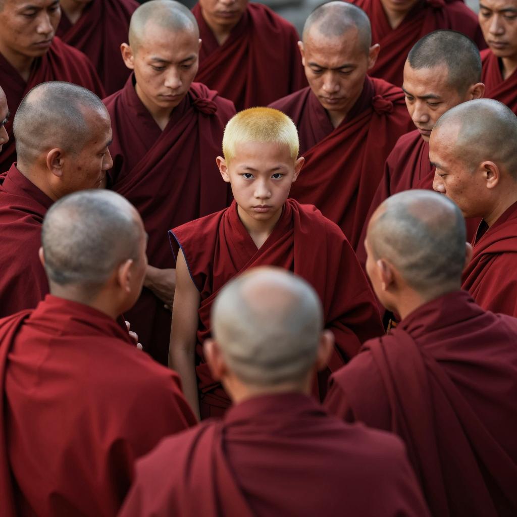 Bald Monks Encircle Young Focused Monk
