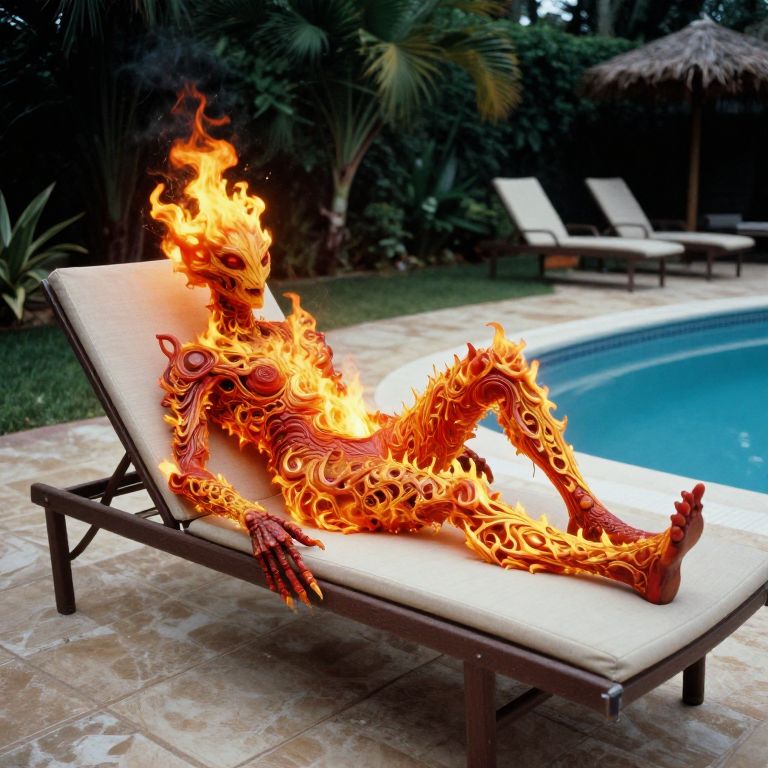A Cinematic Photography, Kodak Motion Picture Film style, Analog photography Over saturated Photo of an intricate weird fire creature, The intricate weird fire creature relaxing on a sun-lounger next to a Swimmingpool