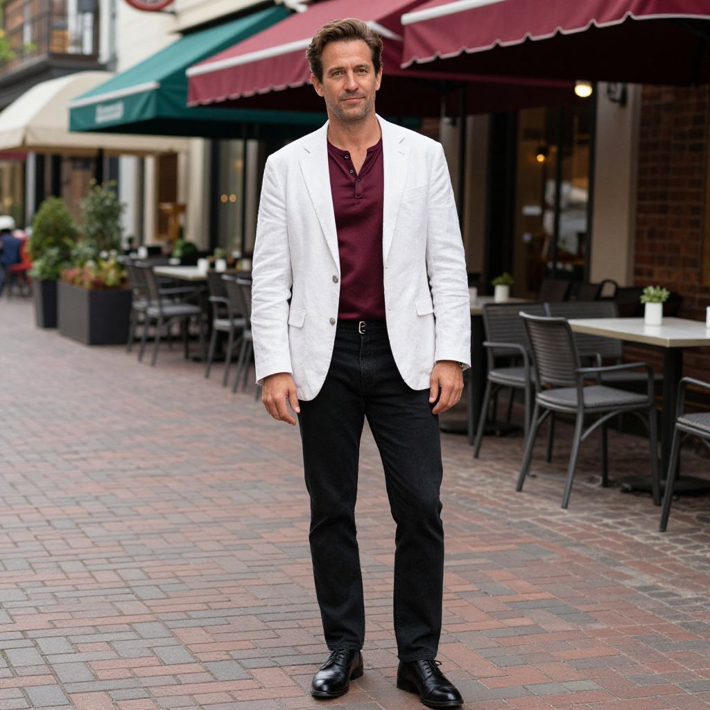 "a man, burgundy silk henley shirt, black skinny jeans, tailored white linen blazer, sleek black dress shoes, subtle silver cufflinks, charming brick pathways, colorful awnings, outdoor seating, lithographic film style, confident smile, relaxed demeanor. Man has masculine face and piercing eyes"