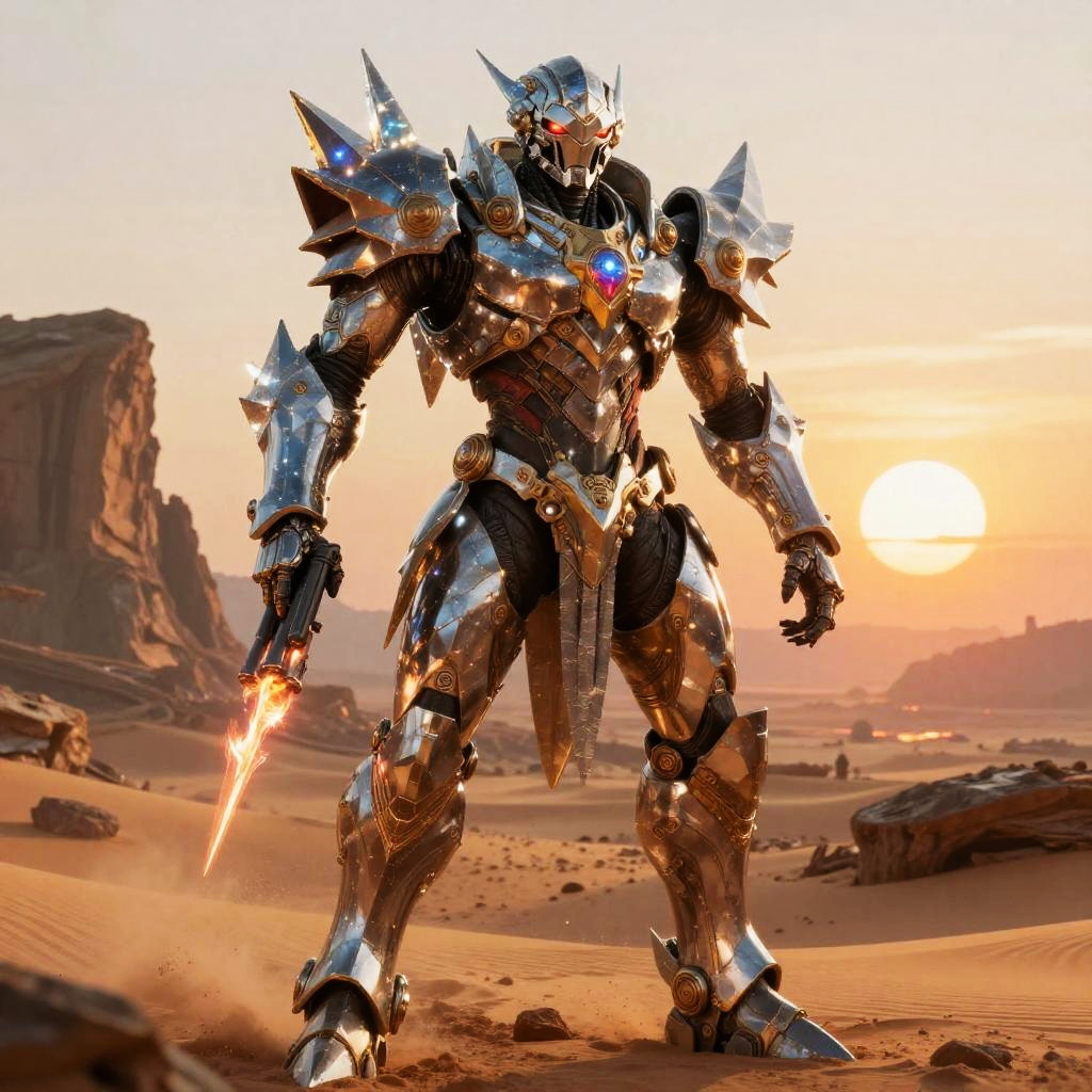 A digital CGI image of a towering, armored warrior standing in a desert at sunset. The warrior is clad in highly reflective, metallic silver armor with sharp, angular spikes and glowing blue and red accents. He wields a flaming sword in his right hand. The background features towering rock formations and a glowing orange sun setting over the sandy landscape. The armor's intricate design and the warrior's imposing stance evoke a sense of power and readiness. The light reflects off the armor, enhancing its metallic texture.